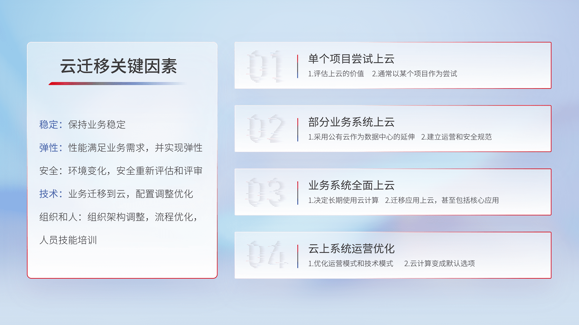 结合实际业务,,,,从规划设计、、云平台选型、、、云原生改造、、数据迁移、、、、集成交付,,迁移全过程为客户识别最佳上云路径,,做好风险识别管理,,设计网络架构、、、、身份权限、、、安全审计合规、、、操作审计、、日志审计、、、、监控告警策略、、、、多站点容灾设计等,,,对云上基础设施进行整体规划,,提升IT治理水平,,,以满足弹性、、高可用、、、高性能的需求。。。